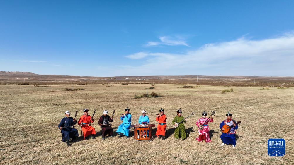 10月16日,乐队成员在草原上进行“乃日”表演(无人机照片)。