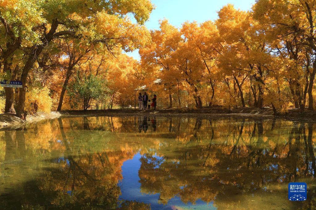 10月17日,游客在甘肃省敦煌市莫高镇的胡杨林中赏景。