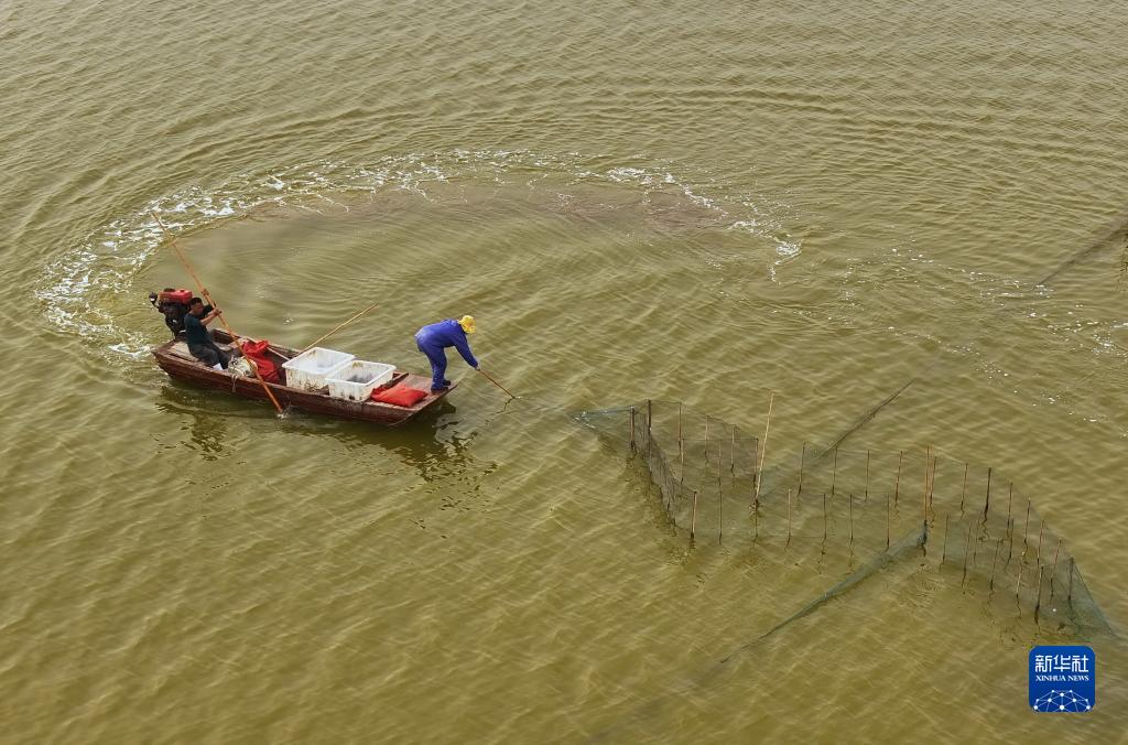 10月17日,在河北省唐山市曹妃甸区,水产养殖户在捕捞利用盐场盐田卤水养殖的南美白对虾(无人机照片)。