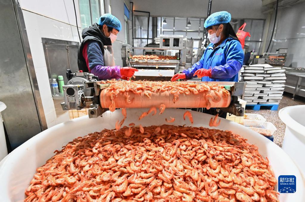 10月17日,工人在河北省唐山市曹妃甸区一家水产加工企业的南美白对虾加工生产线上工作。