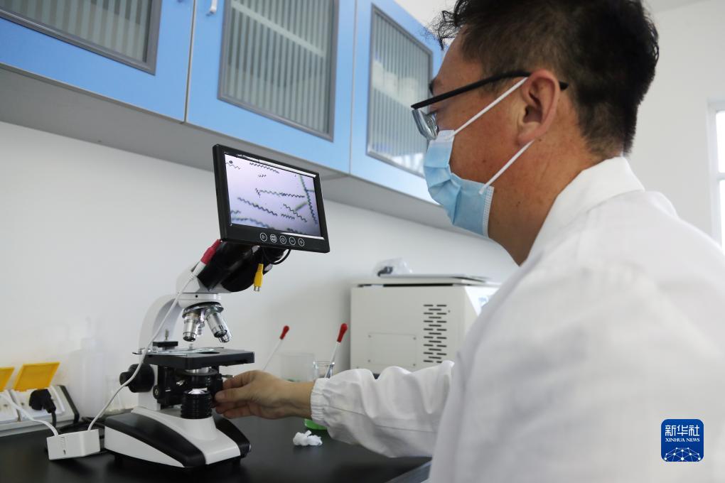 10月17日,园区工作人员观察螺旋藻样品情况。