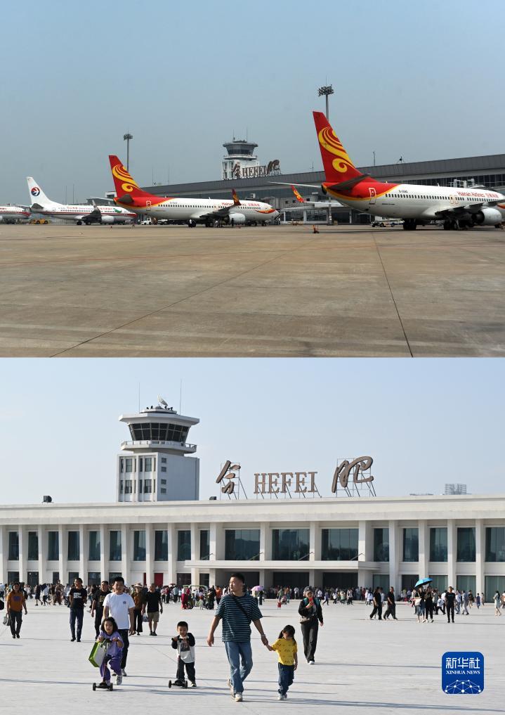 这是一张拼版照片:上图为2013年5月24日,客机停在合肥骆岗机场停机坪上(新华社发 黄洋洋摄);下图为2023年9月30日,游客在合肥骆岗公园参观(新华社记者周牧摄)。