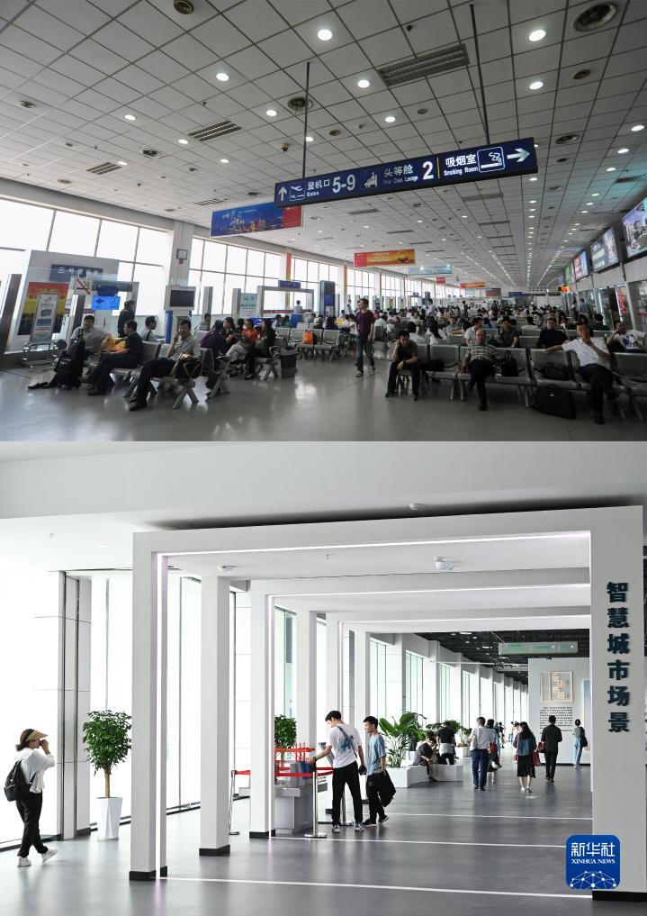 这是一张拼版照片:上图为2013年5月24日,旅客在合肥骆岗机场候机楼内候机(新华社发 黄洋洋摄);下图为2023年9月27日,游客在合肥骆岗公园内的城市建设馆参观,该馆由原合肥骆岗机场候机楼改造而成(新华社记者周牧摄)。