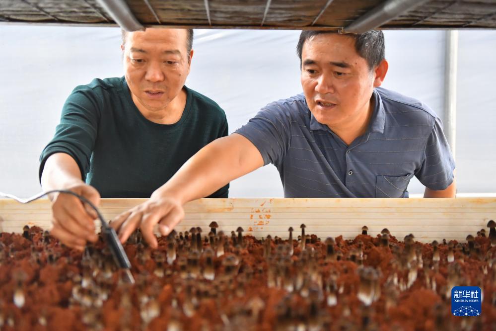 10月18日,在湘潭市雨湖区姜畲镇泉塘子村,技术人员(左)在“5G智慧小菇房”指导村民在菇床上放置土壤湿度传感器。