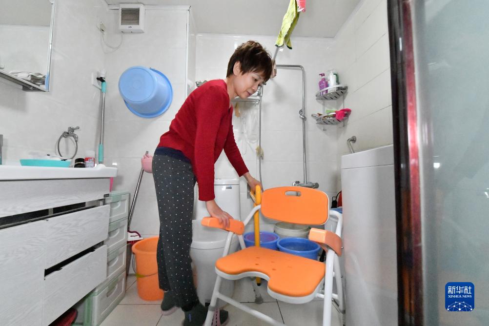 10月17日,在天津市河西区尖山街道,居民在家中卫生间内摆放助浴椅、防滑扶手等适老化改造设施。