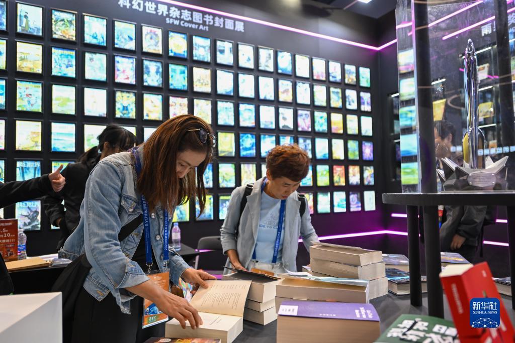 10月18日,观众在2023成都世界科幻大会主题展览上挑选科幻书籍。