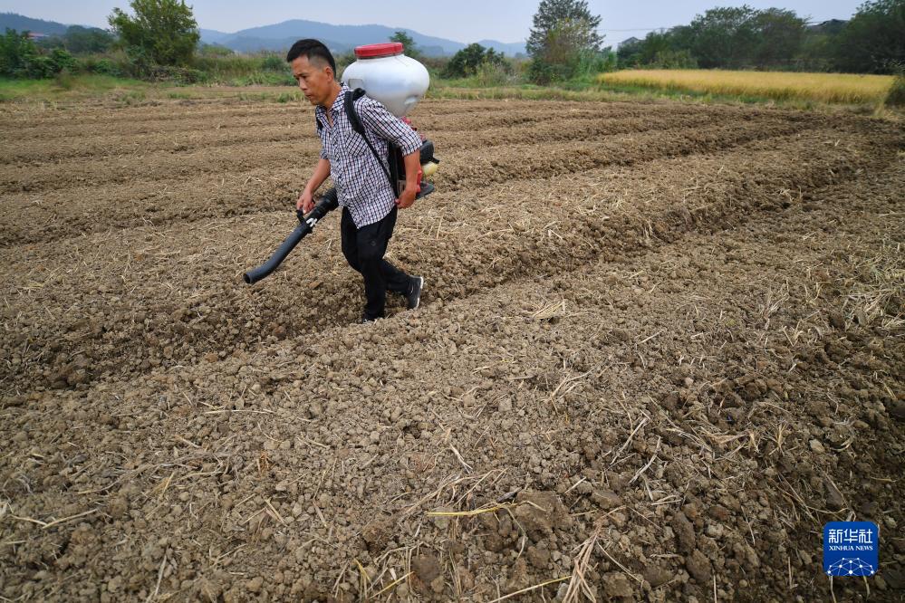 10月19日,在湖南省湘潭市雨湖区鹤岭镇晶鑫村,农户在田间播种油菜。
