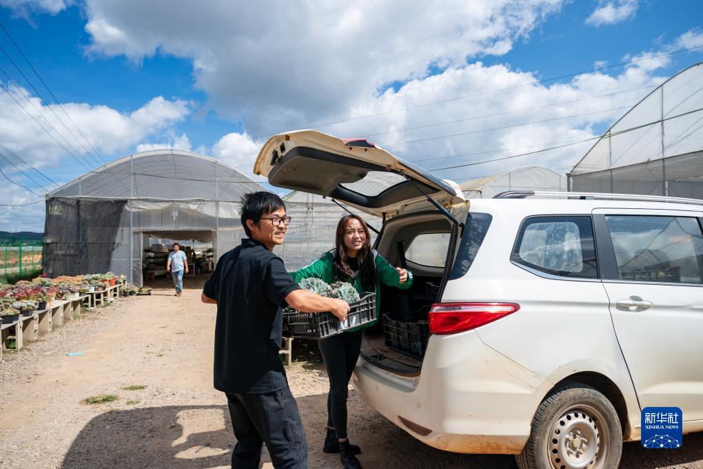 10月18日,李思敏(右)和同事在位于晋宁区宝峰街道的直播基地搬运多肉植物。