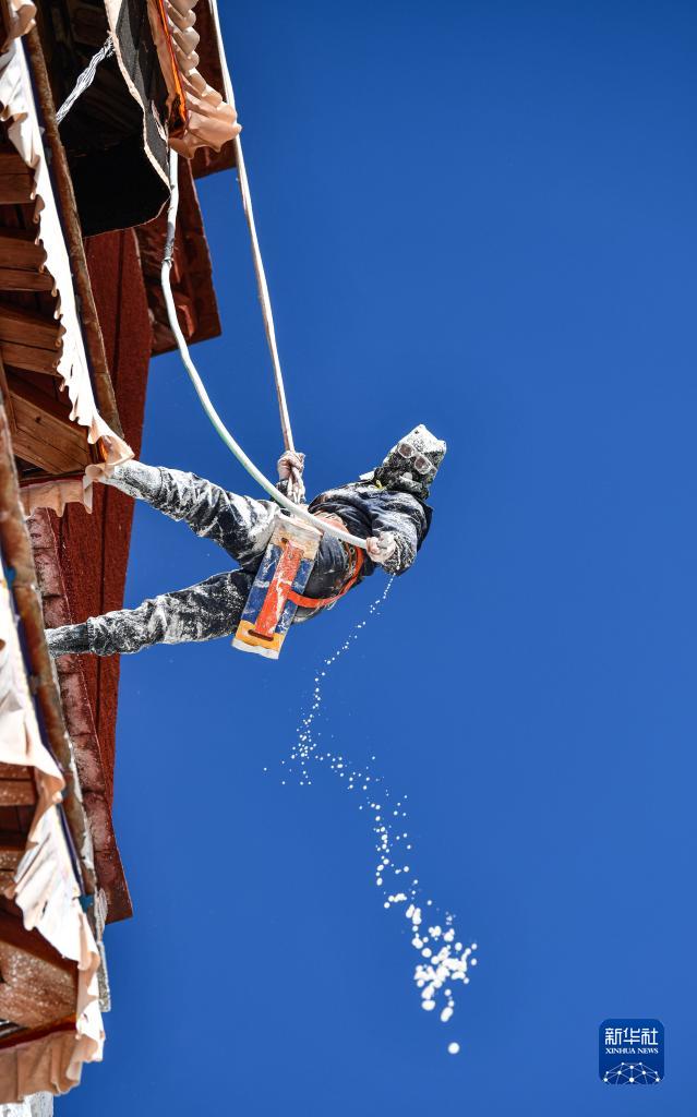 工作人员对布达拉宫外墙喷洒涂料(10月18日摄)。