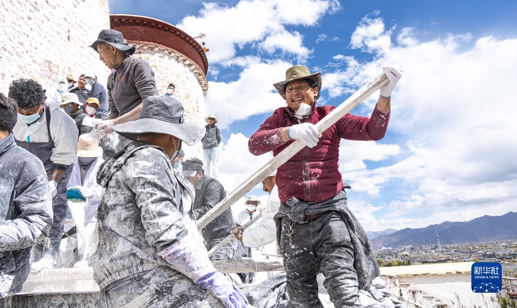 近日,西藏布达拉宫开始进行粉刷维护工作。为使经过一年日晒雨淋的红墙白壁保持鲜亮光彩,每年秋冬交替时节,布达拉宫外墙都要进行粉刷“美容”。