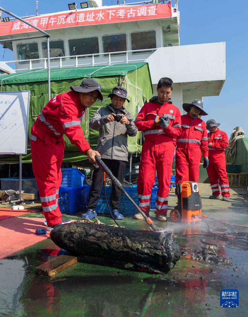 考古工作者在清洗出水的靖远舰210毫米主炮弹。(2022年10月8日摄)。