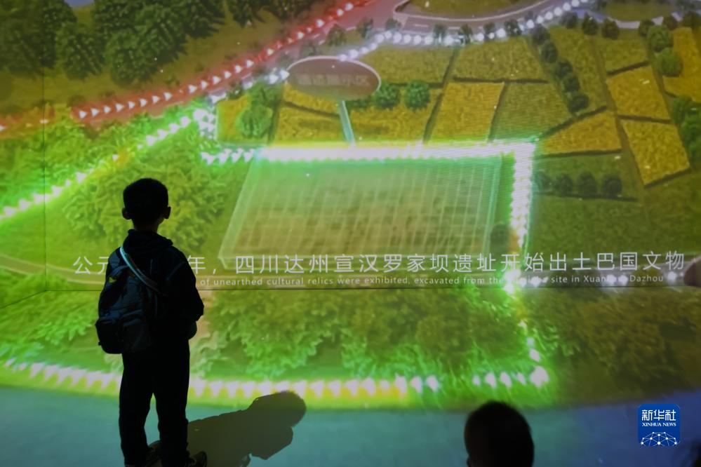 10月19日,在2023成都世界科幻大会主题展览上,参观者观看宣汉罗家坝遗址视频投影。