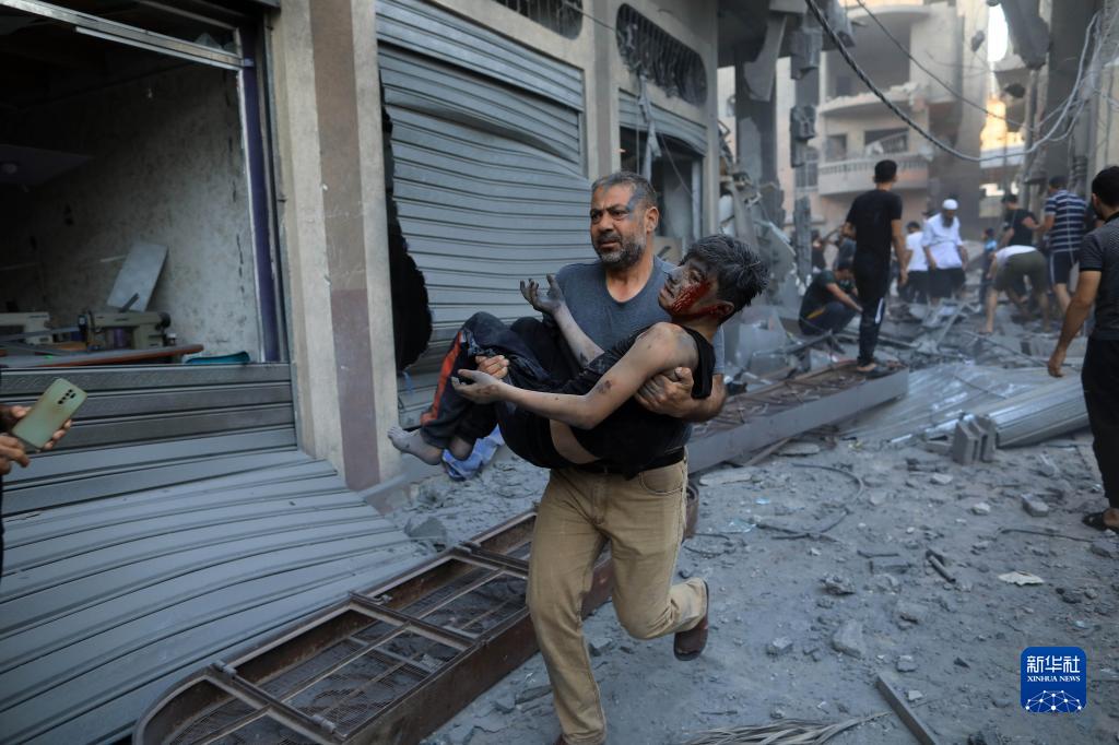 10月19日,在加沙地带南部城市汗尤尼斯,人们在遭以色列空袭后的建筑废墟中救援伤者。