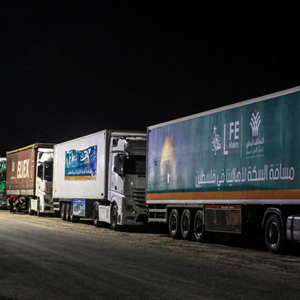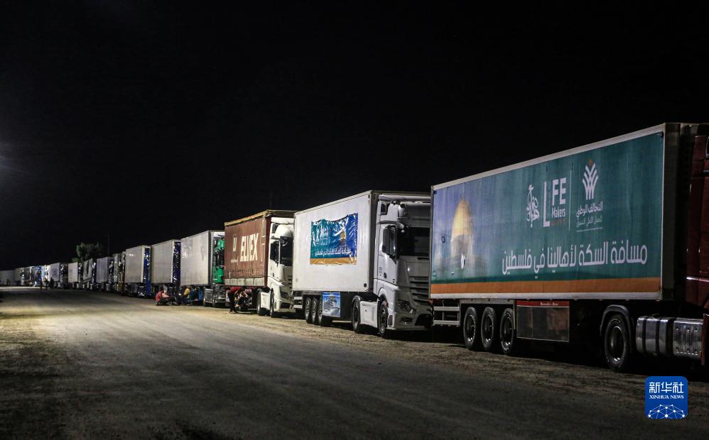 10月19日,在拉法口岸埃及一侧,装载有人道援助物资的货车在等待拉法口岸开放。