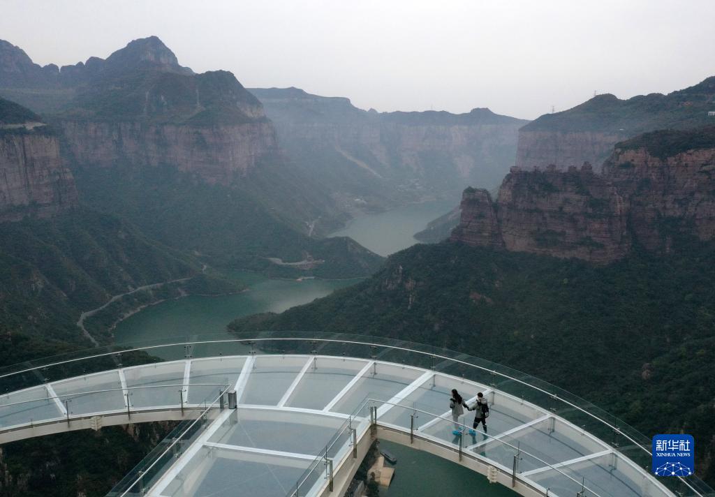 10月19日,游客在河南宝泉旅游度假区的观景平台游玩(无人机照片)。