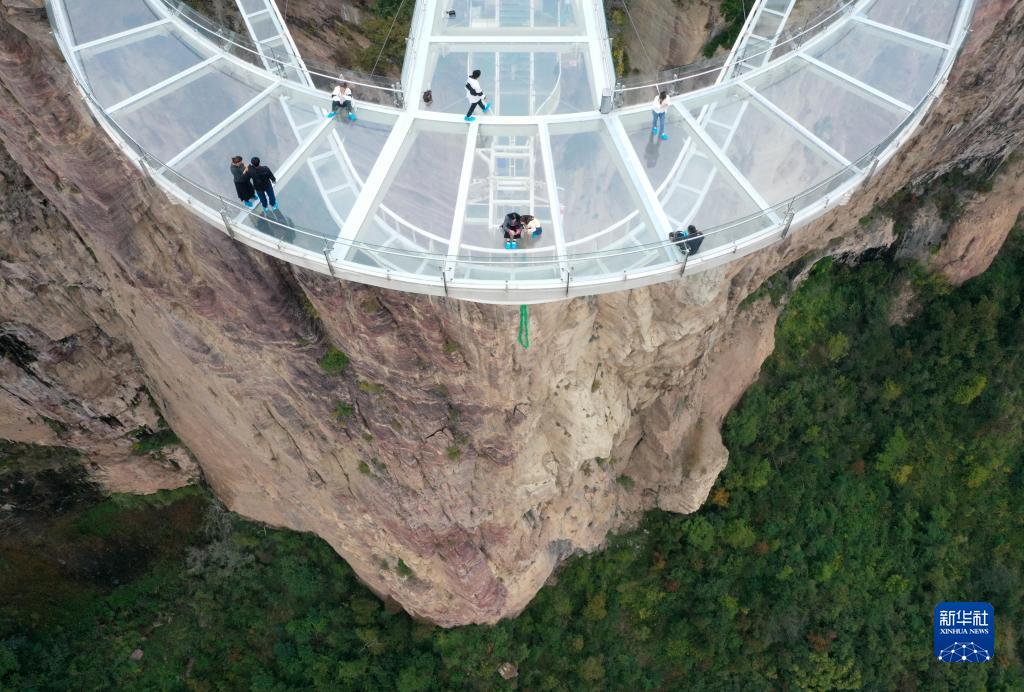 10月19日,游客在河南宝泉旅游度假区的观景平台游玩(无人机照片)。