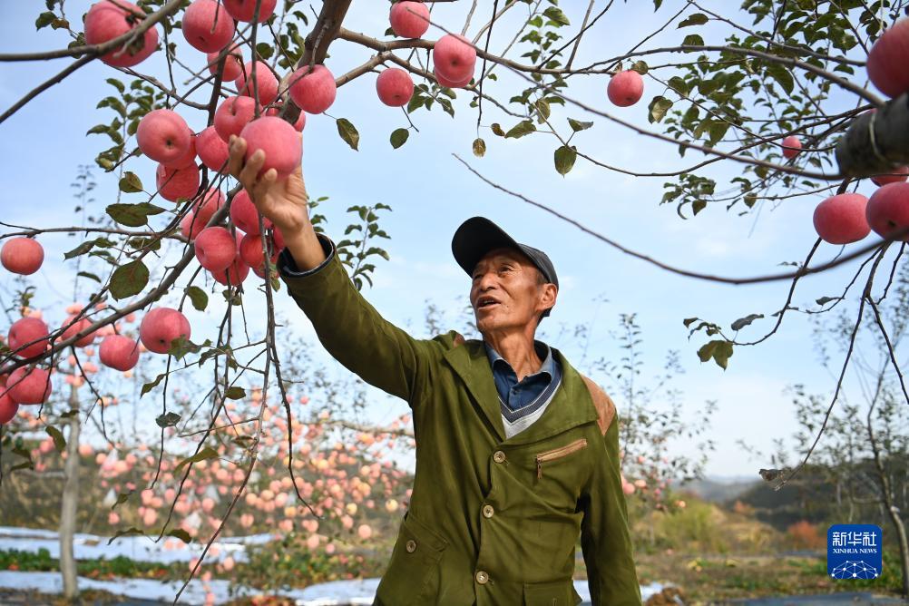 10月19日,南沟村果农胡福义在自家果园查看苹果长势。