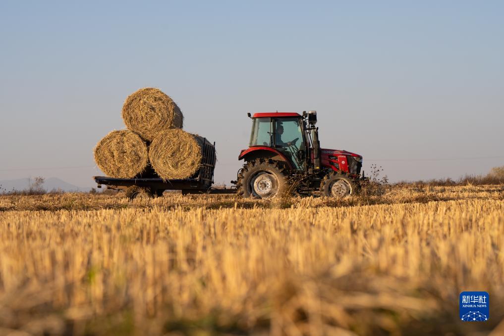 10月18日,在黑龙江省尚志市河东朝鲜族乡,农民驾驶拖拉机运输打捆后的秸秆。
