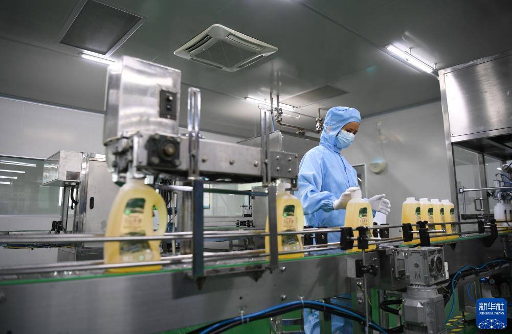 在位于乳源瑶族自治县的广东宝华农业科技股份有限公司车间内,工作人员在茶油灌装生产线上(10月19日摄)。
