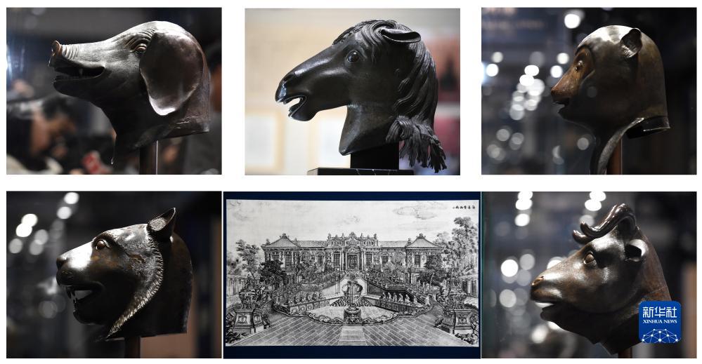 这是一张拼版照片:上三图分别是猪首、马首、猴首铜像(从左至右);下三图分别为虎首铜像、现场展出的可看出十二兽首当年位置的圆明园铜版画、牛首铜像(从左至右,10月20日摄)。