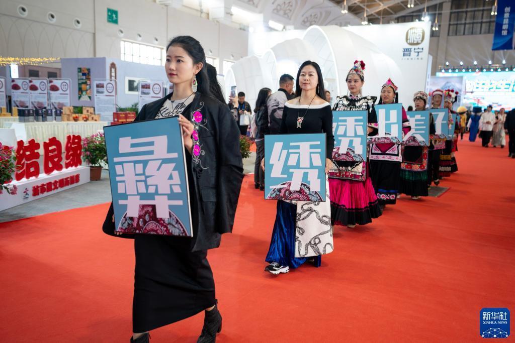 10月20日,参展工作人员在创意云南文化产业博览会上展示彝绣服饰。