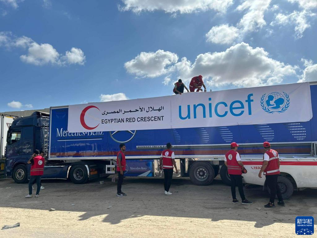 10月20日,在埃及东北部距离拉法口岸45公里的阿里什,埃及红新月会的工作人员在准备运送援助物资的卡车。