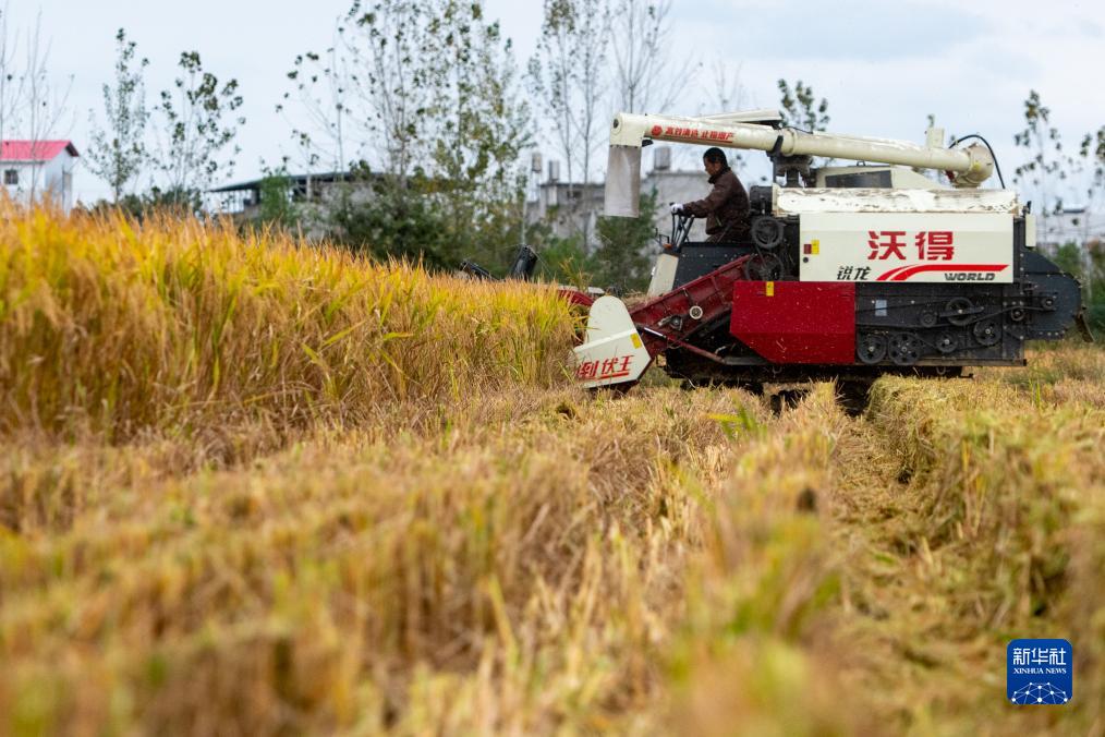 在湖北省天门市石家河镇唐店村,农民操作农机收割水稻(10月19日摄)。