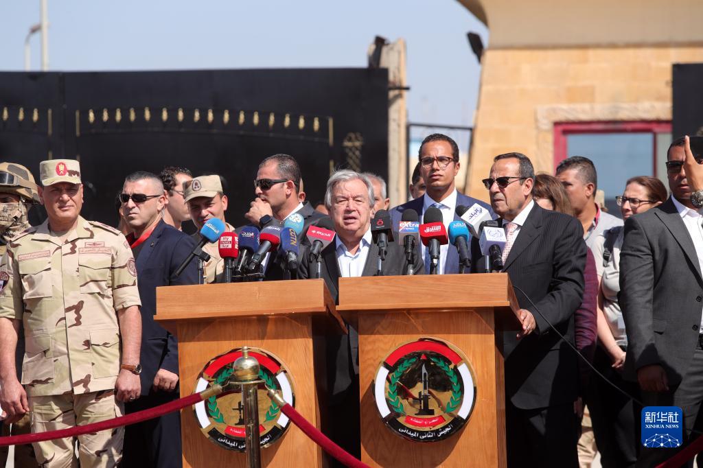 10月20日,在拉法口岸埃及一侧,联合国秘书长古特雷斯(中)发表讲话。新华社发(艾哈迈德·戈马摄)