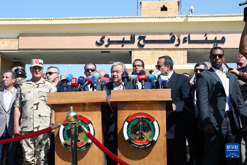 10月20日,在拉法口岸埃及一侧,联合国秘书长古特雷斯(中)发表讲话。新华社发(艾哈迈德·戈马摄)