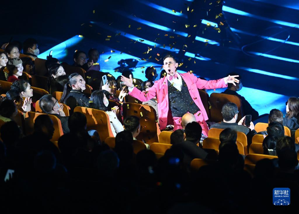 10月20日,演员在第十九届中国吴桥国际杂技艺术节开幕式上与观众互动。