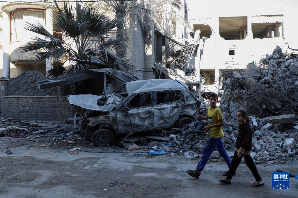 10月20日,在加沙地带南部城市汗尤尼斯,儿童走过遭以色列袭击损毁的建筑。