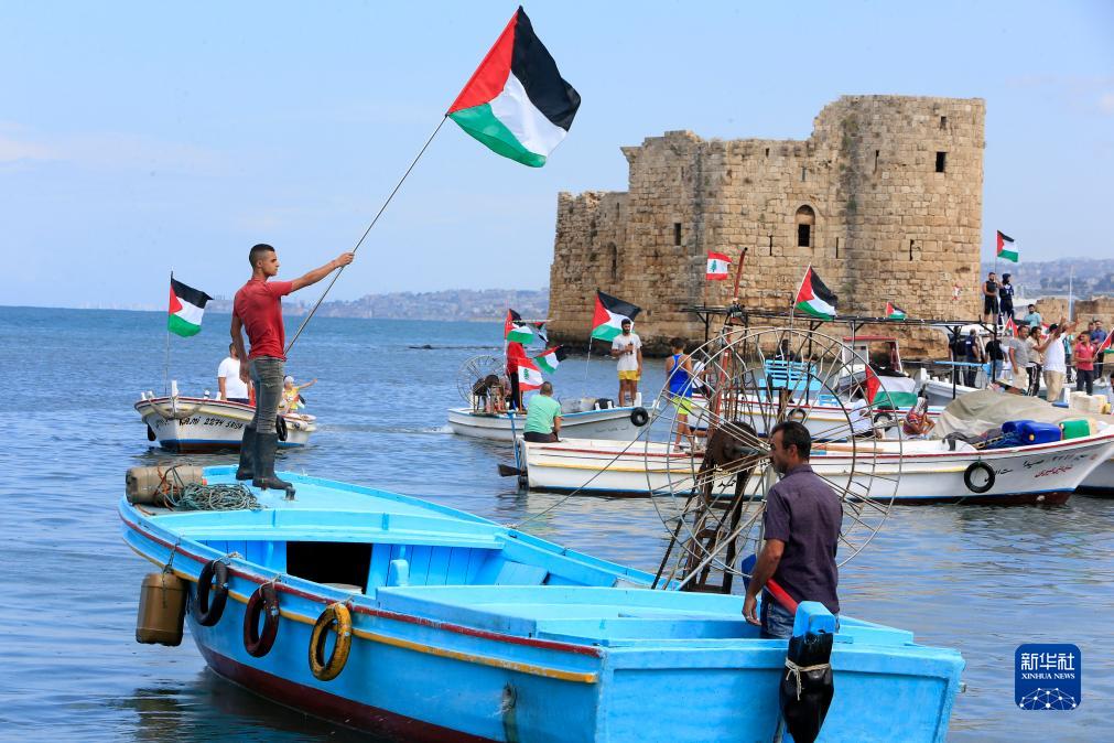 10月20日,在黎巴嫩南部西顿,渔民参加水上游行活动。