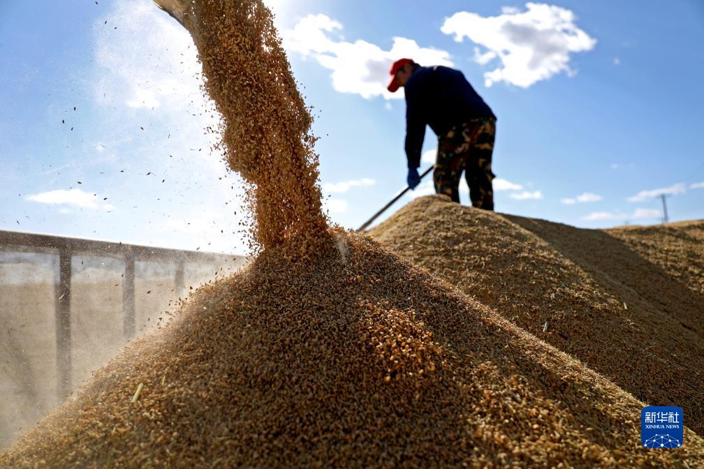 10月20日,一名工人在盘锦市辽河三角洲尤巧元家庭农场的货车里整理刚刚收割装运的水稻。