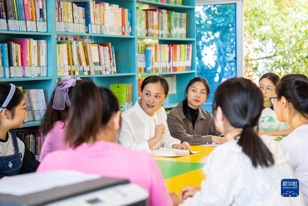 10月19日,常德市桃源特殊教育学校校长彭敏(中)在该校青年教师座谈会上与青年教师沟通。