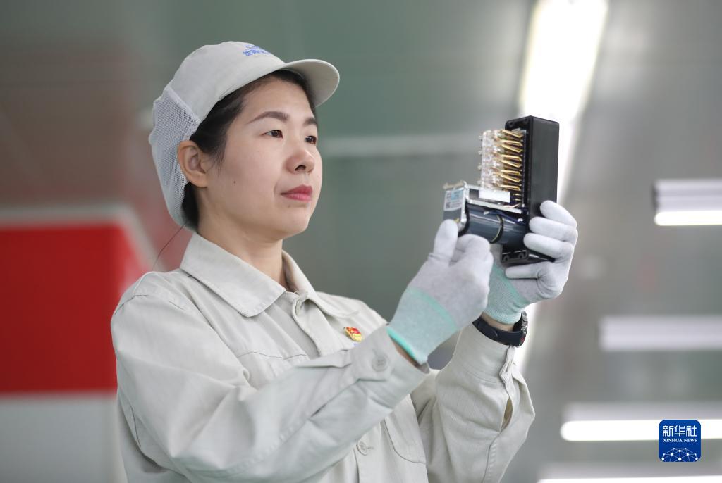 柯晓宾在沈阳铁路信号有限责任公司电器车间查看继电器(10月17日摄)。
