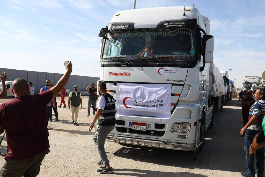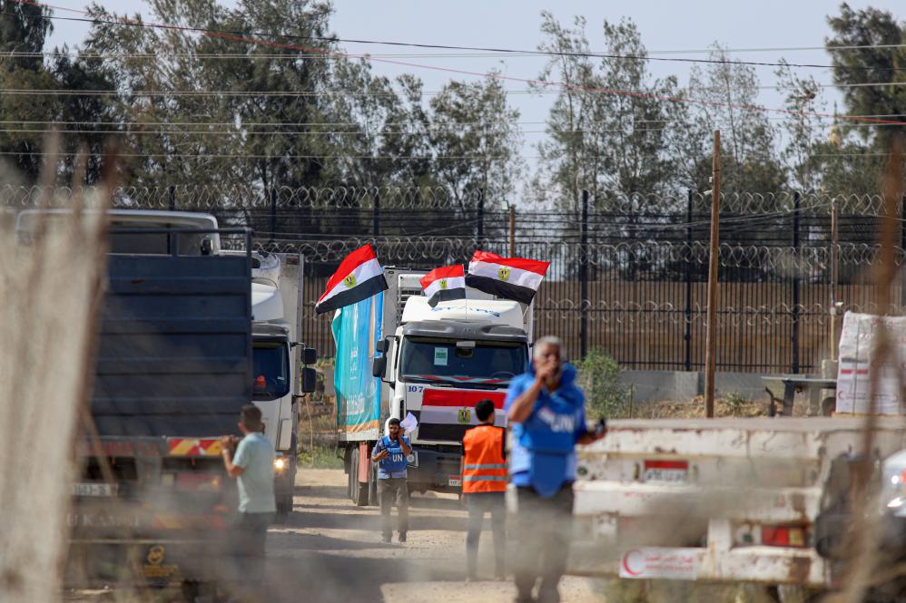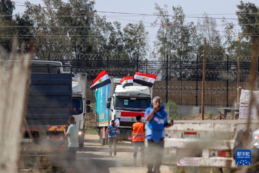 10月21日,装载有人道援助物资的货车通过拉法口岸进入加沙地带。