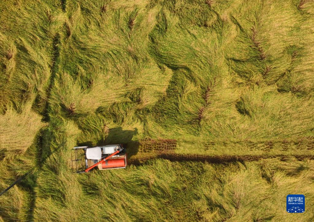 10月21日,在湖南省衡阳市祁东县金桥镇,当地村民驾驶农机收割晚稻(无人机照片)。