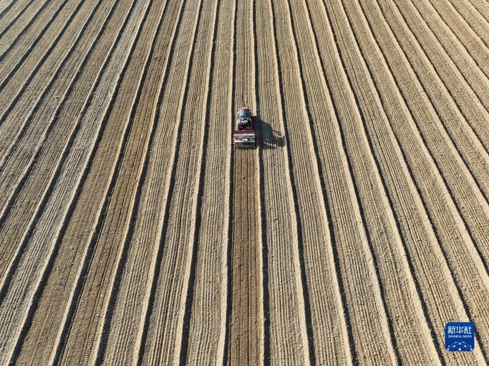 10月21日,河南省济源市轵城镇柏林村农民驾驶农机在田间播种冬小麦(无人机照片)。