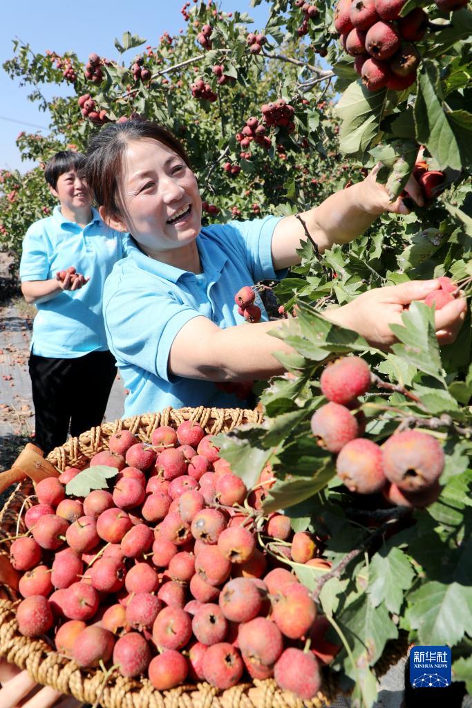 10月21日,农民在山东省东营市东营区现代高效农业产业园蓝海逸园生态基地采收山楂。