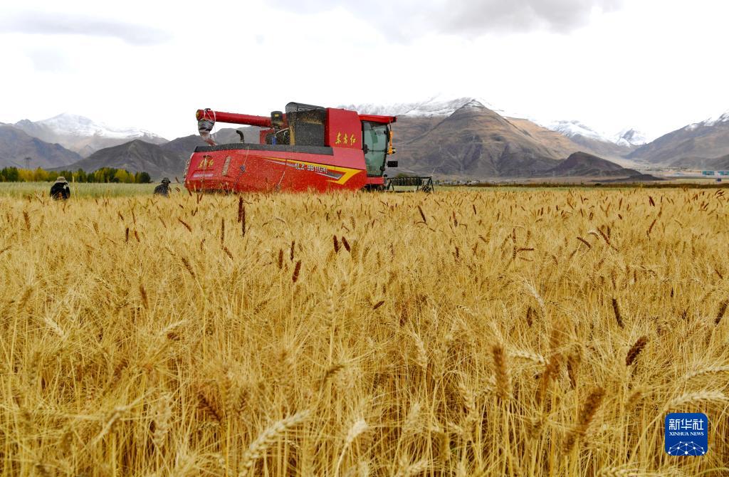 工作人员驾驶农业机械在西藏拉萨市林周县曲果强村的高标准农田里收获小麦(10月12日摄)。