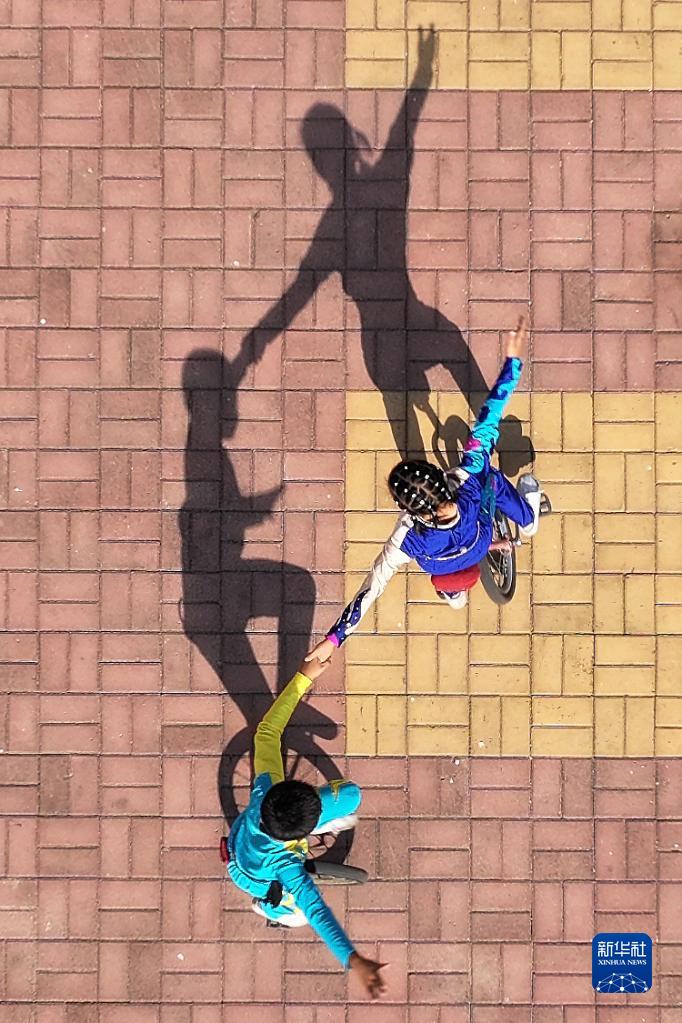 10月18日,杂技学员在河北省沧州市吴桥县于集镇东街一特色杂技小院练习杂技(无人机照片)。