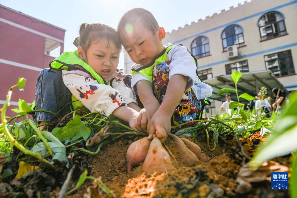 10月16日,湖南省永州市道县城东幼儿园的小朋友在体验采收红薯。