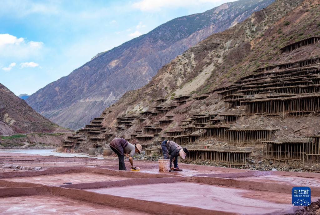西藏昌都市芒康县纳西民族乡村民在盐田里劳作(10月20日摄)。