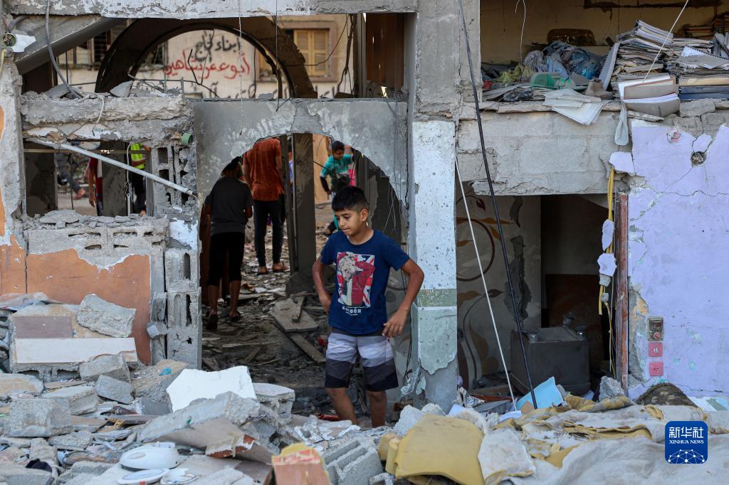 10月21日,在加沙地带南部城市汗尤尼斯,一名儿童站在遭以色列袭击的建筑废墟上。