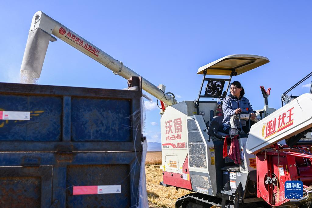 10月20日,刘春艳在珲春市三家子满族乡东岗子村的水稻田里驾驶收割机收割水稻。