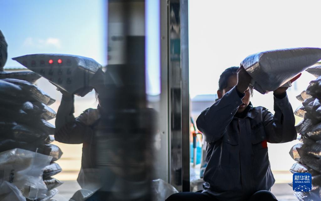 10月20日,刘春艳在她的现代化米业加工厂内打包大米。