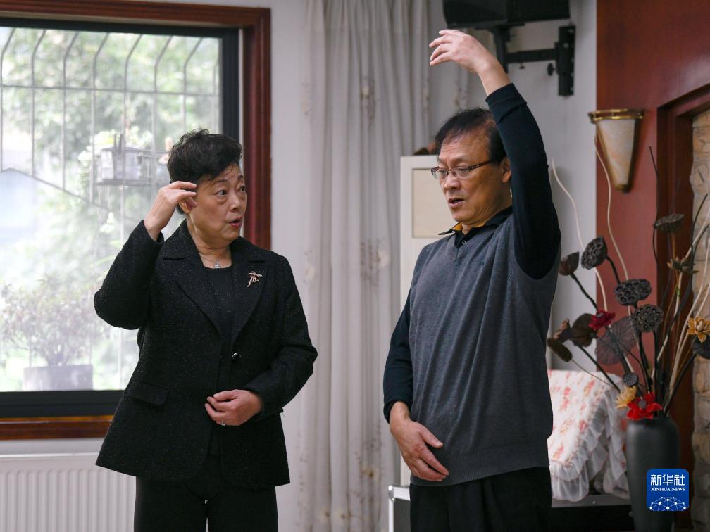 10月21日,郑义华(左)和丈夫李永东在家练习声乐发声。