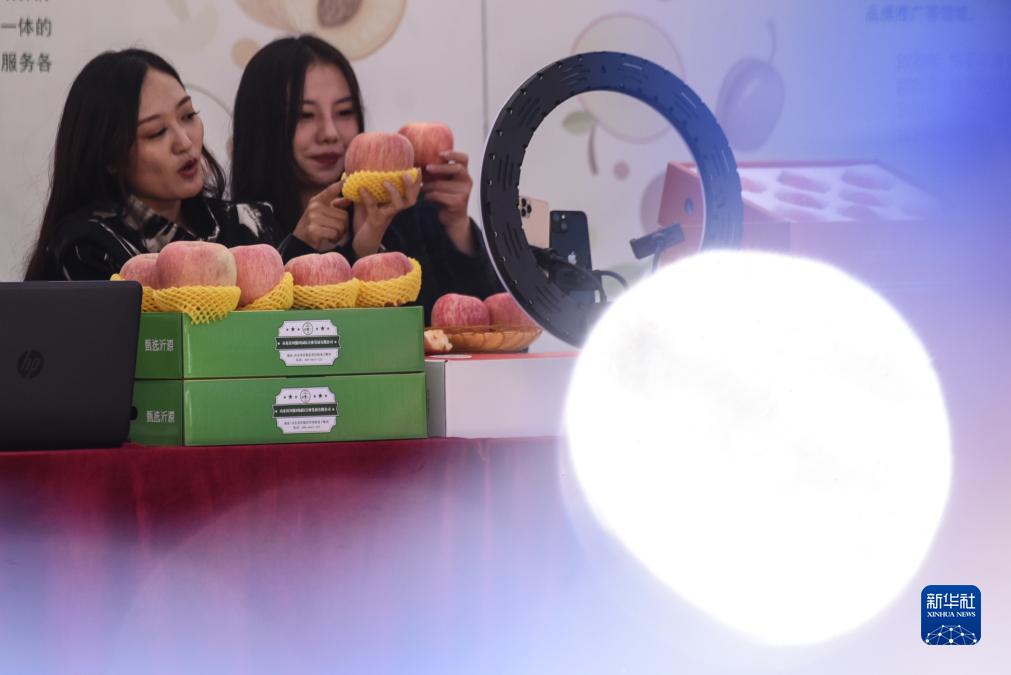 10月22日,工作人员在山东沂源苹果节电商销售大赛上直播带货。
