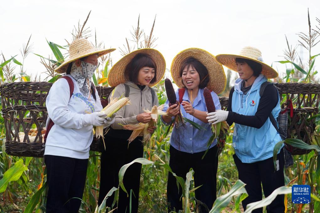 在北京市平谷区北台头村“博士农场”,王翠云(右二)采摘完玉米后与村民交流(10月4日摄)。