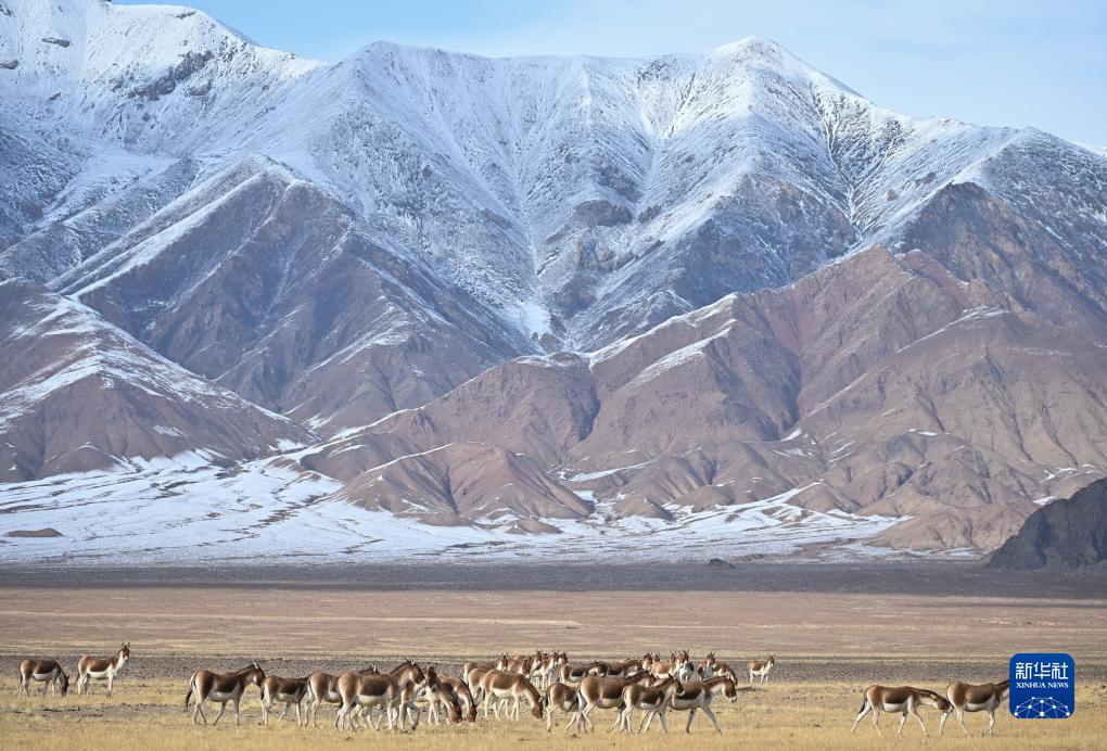 10月16日,在阿尔金山国家级自然保护区,藏野驴在草原上觅食。